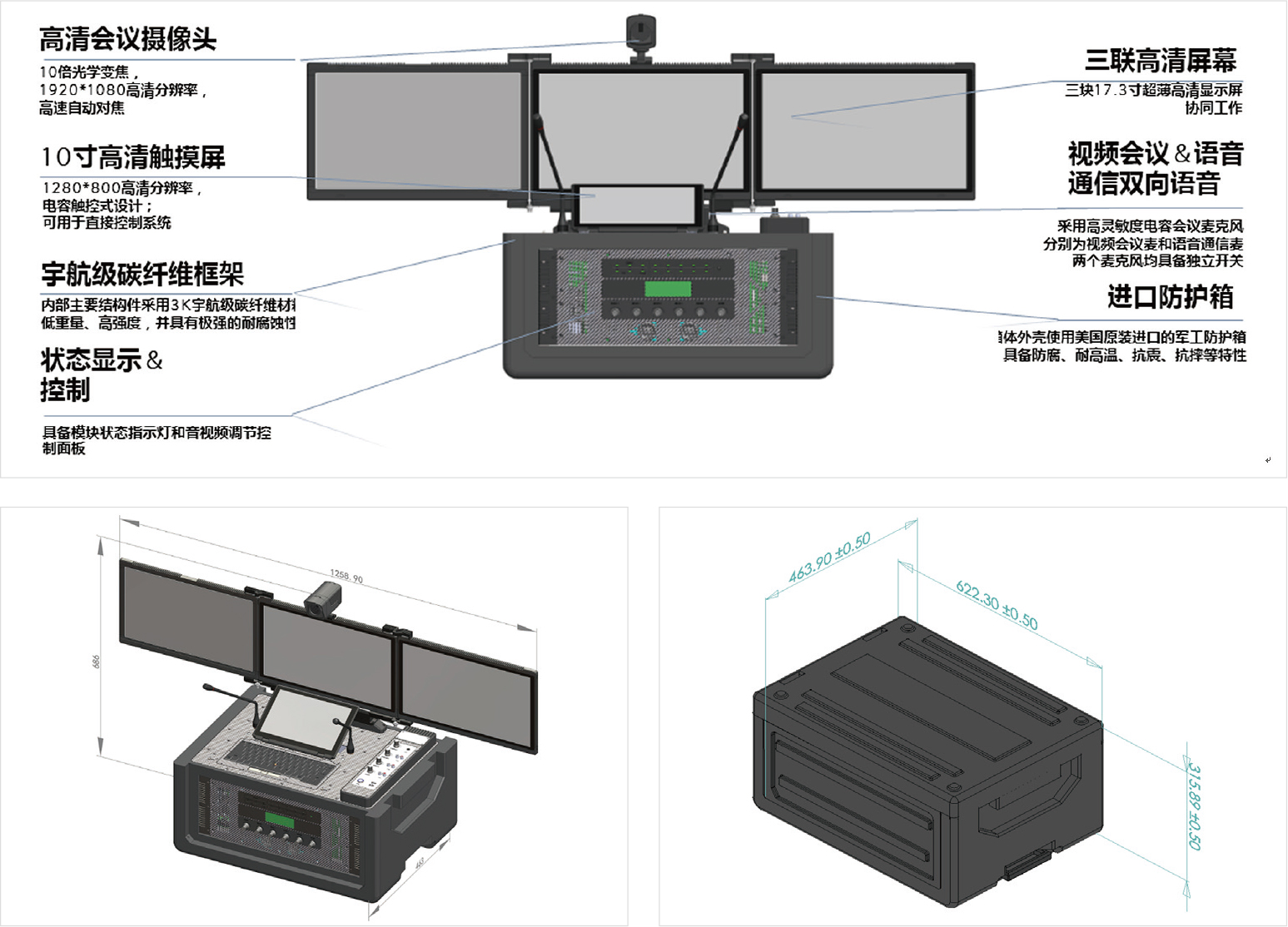◆ 四屏協同顯控:設備自身具備四塊屏幕,其中三屏采用翻折式設計(單屏尺寸為17.3寸),一屏觸控(10.1寸),四屏聯動使用;