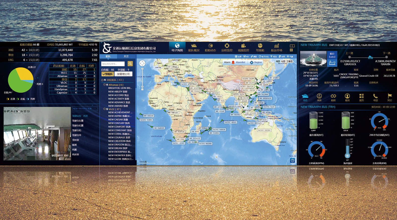 船隊運營管理可視化平臺,該平臺的是以海圖為基礎平臺,可以單船、同型號姊妹船舶、同噸位不同型號船、船隊等為經營 管理的核算單位,將船舶位置跟蹤、位置監控、視頻監控、船舶安全、氣象服務等航海信息服務與經營生產數據信息集成整合, 提供船舶工況監控和生產數據分析,是服務于船舶安全管理和生產運營的一體化可視平臺。